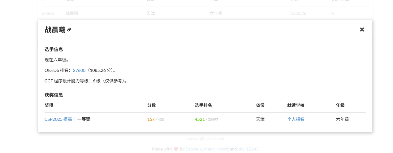 14 号晚上出了最终成绩和评级规则,15 号获奖数据导入了 OIerDB,至此,我也可以被搜到了!